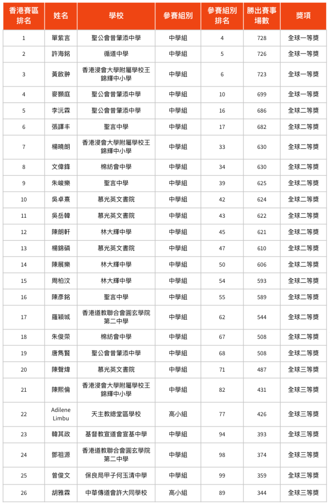香港隊派出的參賽選手多為中學組,共有 4 人在該組別獲得全球一等獎, 在 50 多個參賽國家和地區中排名第一。在其他組別方面,林大輝中學的關文龍老師獲得公開組第 7 名,被授予全球一等獎。兩位參賽的高小組學生亦獲得該組別的首 100 名,被授予全球三等獎。