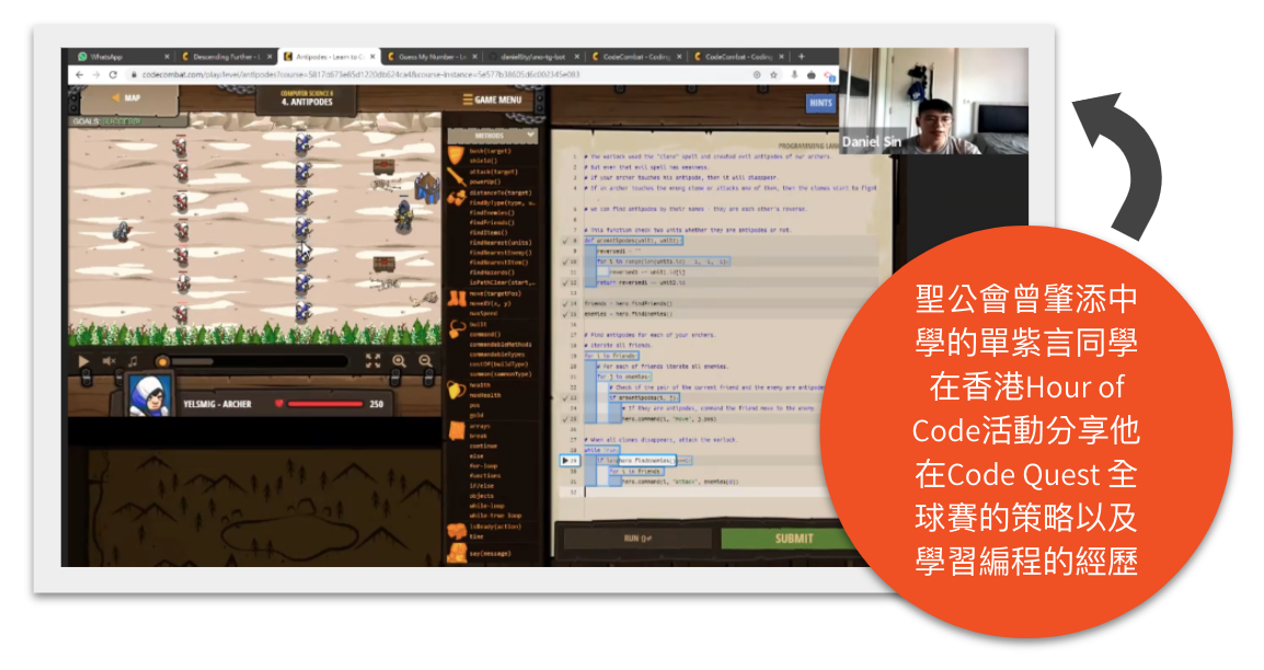 世界上最大規模的青少年人工智能編程比賽、被譽為「青少年編程世界盃」的Code Quest全球總決賽落下帷幕。在全球一等獎的競爭中,香港隊戰績極其出色,共取得5名一等獎的成績,在50多個參賽國家和地區中排名第三。其中來自聖公會曾肇添中學的單紫言、循道中學的許海銘和香港浸會大學附屬學校王錦輝中小學的黃啟翀更獲得全球總排行榜的頭十名, 表現非常出色。