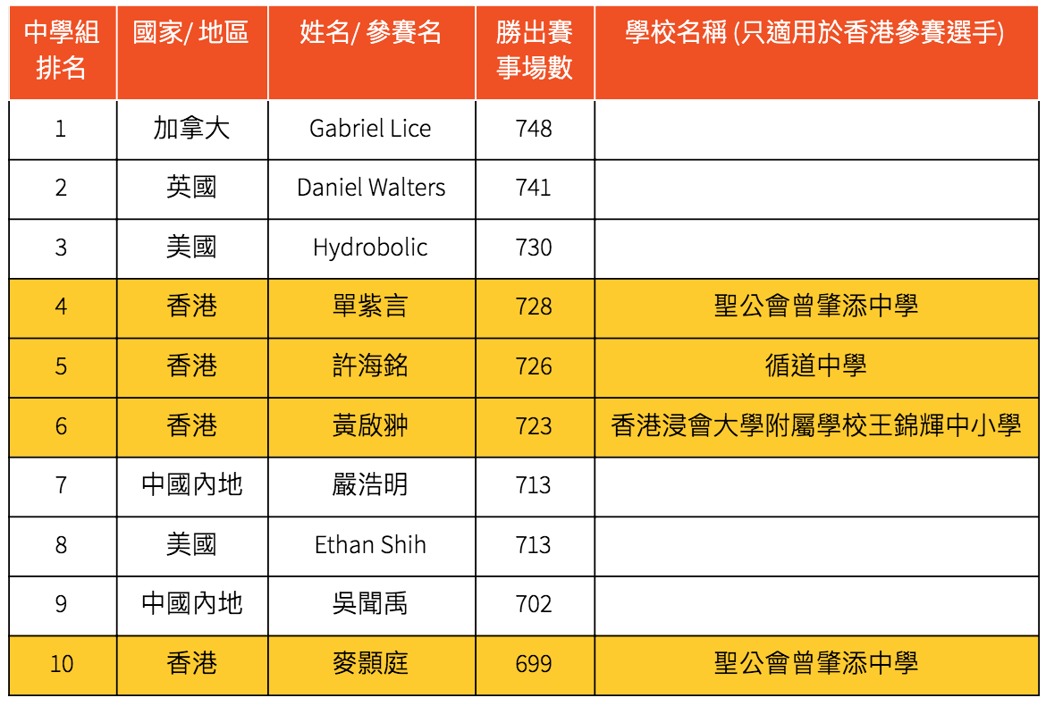 排名的順序是按照取勝場數由高到低進行排列:其中每個組別的第 1-10 名被授予全球一等獎;二等獎按照勝場數劃分,初小組取 300 勝場及以上選手,高小組、中學組和公開組皆取 500 勝場及以上選手;三等獎中,初小組取勝場數為1-299場選手,高小組、中學組和公開組皆取勝場數為 1-499 場選手。